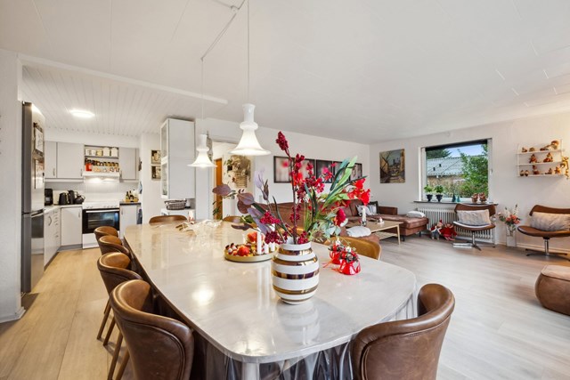 Køkkenet åbner sig op til alrummet og stuen, hvilket giver et naturligt samlingspunkt for hverdagslivet.