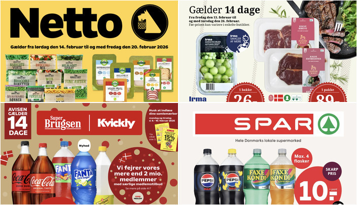 SuperBrugsen tilbyder Coca-Cola, Fanta eller Schweppes i flere varianter (125-150 cl) til en pris af kun 11 kr. pr. flaske. Tilbuddet gælder fra fredag den 6. februar til torsdag den 19. februar 2026.